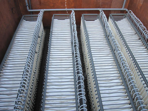 當(dāng)有足夠數(shù)量的有機(jī)營養(yǎng)物、礦物鹽和溶解氧時,微生物在填料的表面繁殖,逐步形成畫膜。由于擴(kuò)散作用,氧和營養(yǎng)物質(zhì)通過膜供微生物吸收利用。當(dāng)膜長到一定厚度就會妨礙這種擴(kuò)散,水中的氧和營養(yǎng)物質(zhì)不能通到內(nèi)層,生物膜開始分層,表層是好氧層。面內(nèi)層由于缺氧形成厭氧層。新形成的厭氧層內(nèi),好氧菌死亡溶解,成為兼性厭氧菌和厭氧菌的營養(yǎng)。當(dāng)內(nèi)層膜營養(yǎng)耗盡,厭氧微生物也大量死亡溶解,于是生物膜內(nèi)層不能支撐表面的生物群體,大塊的生物膜脫落。生物膜脫落而造成的更新面又會形成新的生物膜。另外少量的生物和一些小塊生物膜,由于水的沖刷或氣泡振動,不斷離開生物膜進(jìn)人水中,這就是膜的脫落和更新。膜的脫落和更新對生物膜的活性有積極的作用,可以使生物膜保持穩(wěn)定的生物活性。脫落的膜沉淀后被排出系統(tǒng)。脫落和更新對水質(zhì)也有一定的影響,增加了水的濁度。