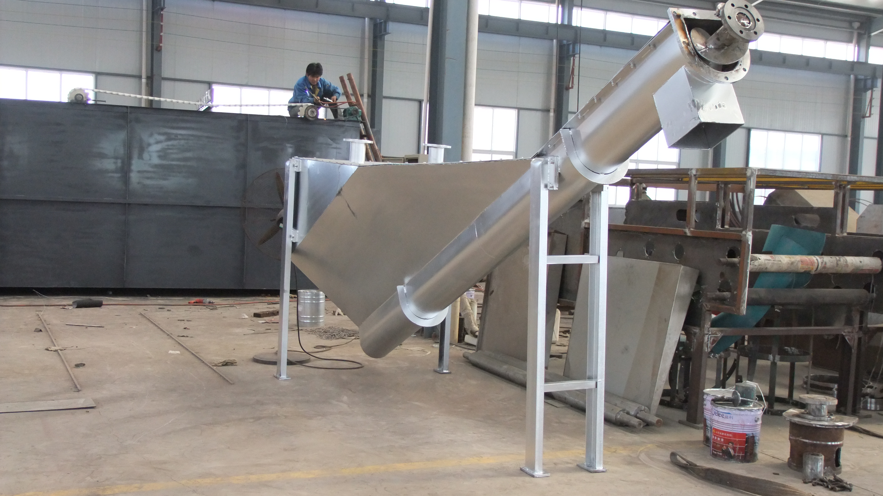 砂水混合物從分離器一端頂部輸入水箱,混合液中重度較大的,如砂粒等將沉積于槽型底部,在螺旋推動下,砂粒沿斜置的槽底提出升,離開液面后繼續推移一段距離,在砂粒充分脫水后經排砂口卸至盛砂桶,而與砂水分離后的水從溢流口排出并送往廠內進水池。