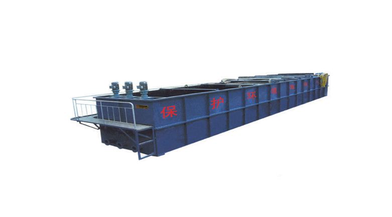 (3)未經處理的污水首先進入曝氣充氣段,與“微氣泡”充分混合,“微氣泡”在上升的過程中,將固體懸浮物帶到水面。刮泥機沿液面運動,將懸浮物刮到傾斜的金屬板上,再將其推入污泥排放管道。污泥排放管道里有水平的螺旋推進器,將所收集的污泥送入污泥收集器,推進器和刮泥機由同一個馬達驅動。凈化后的污水在排放前會經由斜板下方的溢流槽,溢流槽用來控制氣浮槽的水位,確保槽中的液體不會流入污泥排放管道。
