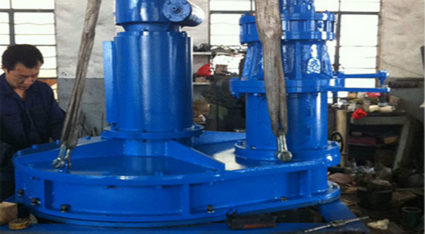 用于給水、污水處理工程中的沉淀池排泥,中心傳動懸掛式整機載荷都作用于工作橋中心,不需中心支墩,簡化了土建結構,一般用于直徑不大于16m的池體。中心傳動懸掛式刮泥機整機主要由橋架、驅動裝置、立軸、水下軸承、雙刮臂和刮泥板組成。其工作流程為:沉淀池污水經工作橋下的進水管流人導流筒,在導流筒傘形罩的均勻分配下呈擴散狀流向池周,污泥依靠自重沉降于池底,刮板在刮臂的帶動下緩慢旋轉,經分離后的上清液通過出水堰板排出池外,沉淀后的污泥由刮板沿池周刮向中心集泥坑,依靠液體靜壓作用經排泥管排至池外。中心傳動刮泥機的塑式有懸掛式和垂架式兩種,其運轉方式又分半橋和全橋方式。對于中心傳動濃縮刮泥機,其刮臂上帶有濃縮柵條,一般用于污水處理廠中、小型輻流式濃縮池中,將進一步分離的濃縮污泥排出濃縮池。