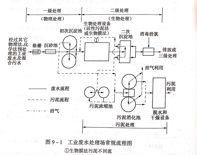 為達到國家污水排放標準,一般的廢水處理場都采用一級處理(物理法或化學法)、二級生物法處理的處理流程(見圖9-1),為避免工業廢水水質不均衡引起對出水水質的影響,在二級生物法處理前后分別設置均質調節池(事故池)和監測池。