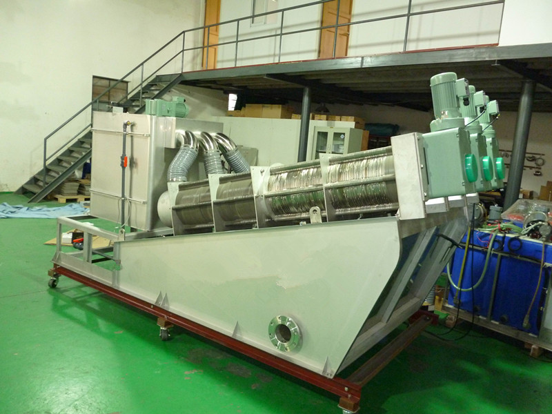 設備前端為濃縮段,后端為脫水段。污泥在濃縮段經重力脫水后,被運輸?shù)矫撍危谇斑M過程中隨著慮縫及螺距的逐漸變小,以及背壓板的作用下,產生極大的內壓,容積不斷縮小,達到充分脫水的目的,